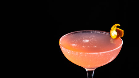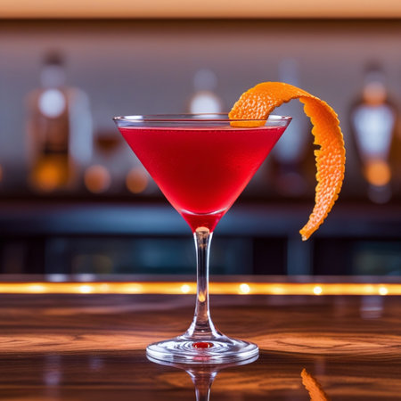 Red cocktail in martini glass with orange peel on bar counter.