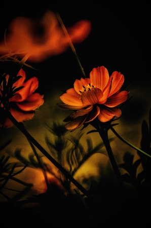 Scenery with cosmos representing autumn . yellow flower blooming in the field, vintage warm tone . free and joyful concept idea background