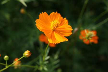 Orange cosmos flower in the summer garden in sunny day. Close-up. Selective focus