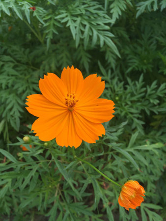 Close up Cosmos sulphureus with buds and green leaves orange summer flowers blooming in beautiful garden landscape