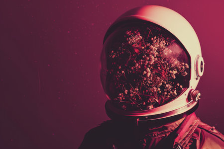 astronaut, surrounded by lush and tropical flowers, during space walk, created with generative ai