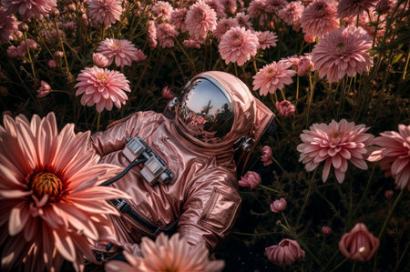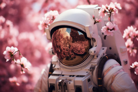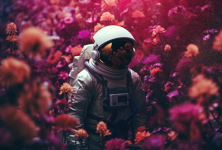 astronaut, with space suit and helmet on, amongst blooming flowers, created with generative ai
