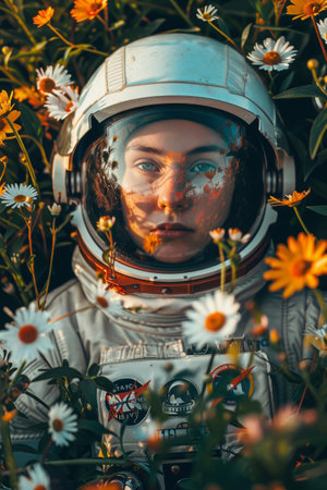 Astronaut in space suit among vibrant flowers in summer meadow. Surreal portrait of a space traveler
