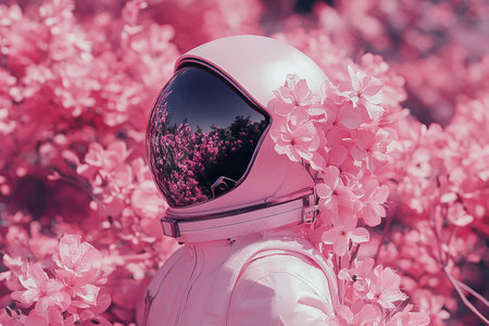 A dreamy pink astronaut stands among vibrant blossoms, embodying a surreal blend of nature and space, capturing the essence of spring and exploration