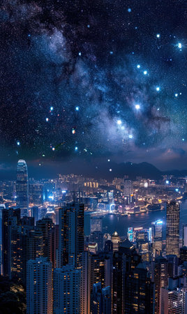 Starry night reveals vibrant city lights against a contrasting dark sky