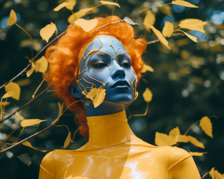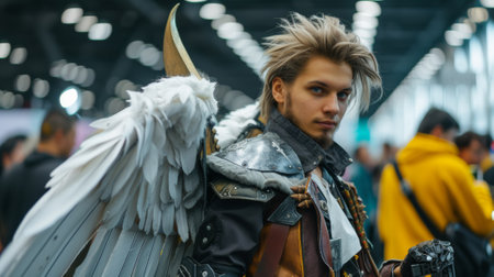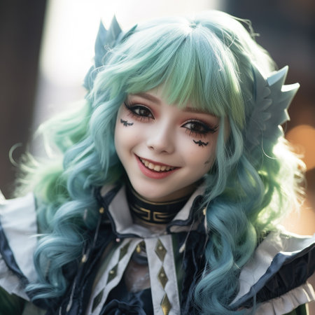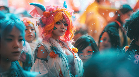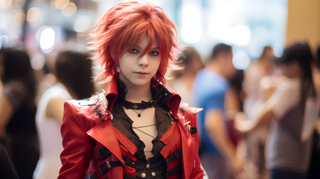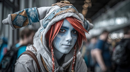 Unique fantasy character with blue skin and red hair, dressed in an intricate hooded costume, surrounded by a lively convention atmosphere, highlighting creative expression, AI generated
