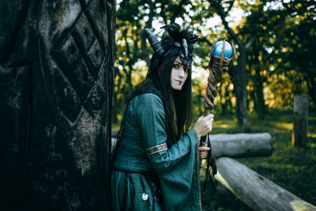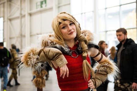 Moscow, Russia-October 06, 2019: IgroMir 2019 and Comiccon Russia 2019. Girl Cosplayer Astrid from the cartoon How to train a dragon-2 with an axe.