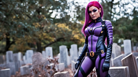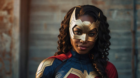 An empowered African American woman, dressed as a superhero. She wears a vibrant costume adorned with a striking mask, exuding strength and determination.