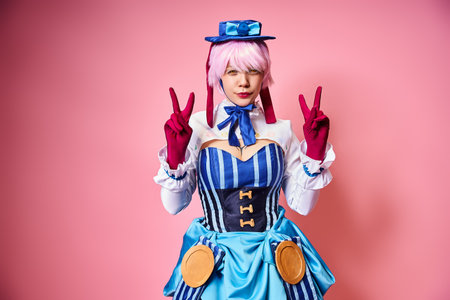 charming sexy woman cosplaying vibrant anime character and showing peace gesture on pink backdrop