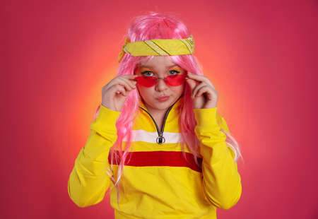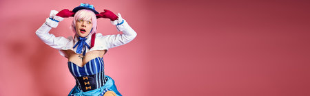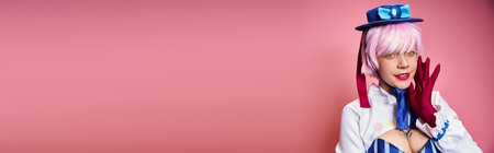 charming sexy woman cosplaying vibrant anime character and looking away on pink background, banner