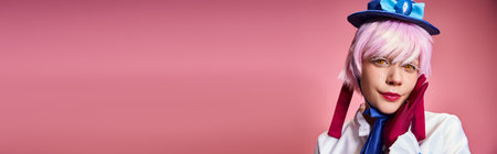appealing chic cosplayer in blue hat and vivid dress looking at camera on pink backdrop, banner