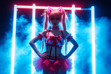 Full Body, Very Attractive Woman Cosplay Anime Japanese Style In Neon Light Standard. Сoncept Gothic Fashion, Night Sky Photography, Ethereal Portraits, Moody Makeup Looks, Enchanting Atmosphere.