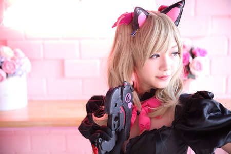 Japan anime cosplay , portrait of girl cosplay in pink room background