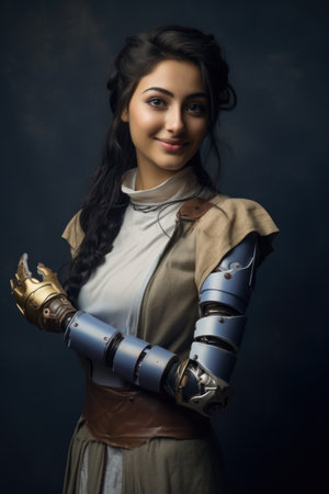 Young girl confidently with technologically advanced prosthetic arm. Integrates natural movement, symbolizing resilience, empowerment, intersection of humanity with cutting-edge assistive technology.