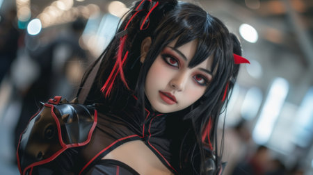 A woman with black hair and red lipstick is dressed in a costume, AI