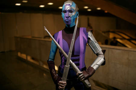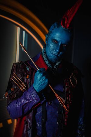 DNIPRO, UKRAINE - JUNE 26, 2019: Cosplayer portraying Yondu Udonta from movie Guardians of the Galaxy by Marvel Comics with the arrow in his hand.