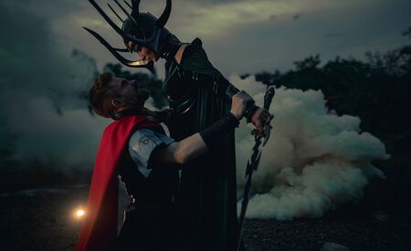 Dnipro, Ukraine- June 5, 2019: Cosplayers portray battle of goddess of death Hela and superhero Thor from Marvel Comics.