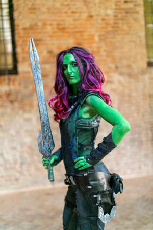 Lucca, Italy - 2018 10 31: Lucca Comics free cosplay event around city Guardians of the Galaxy Gamora. High quality photo