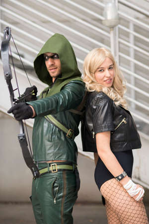 lucca,Italy-october 31,2015:people dressed with cartoons and heroes costumes pose for a photo at the comic fair in Lucca During a sunny day.
