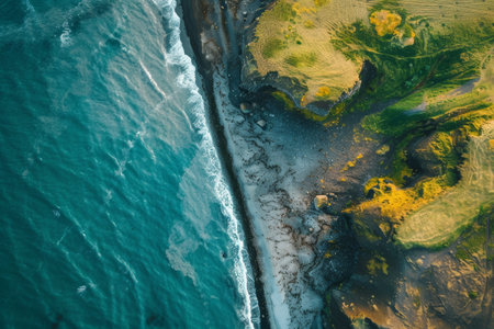 A breathtaking aerial view of a cliff above the ocean with stunning natural landscape, water merging with the sky, and terrestrial plants lining the beach AIG50