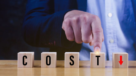 Cost reduction concept, Lean manufacturing management, Decreasing company expense to maximize profits, Hand arranging wooden cube with text cost with red down arrows, Business survival and improvement.