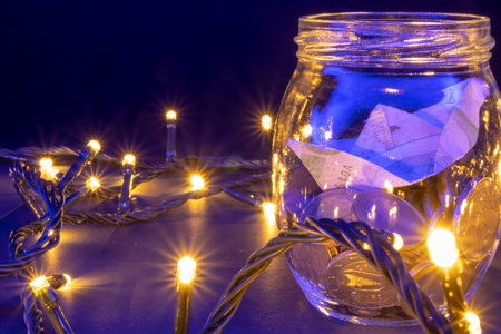 Glass jar with euro coins and paper boat on a dark background with led lights. Euro pocket savings coin concept. Copy space for ad, design, text.