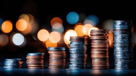 Captivating image of stacks of coins symbolizing financial growth against a vibrant bokeh backdrop, illustrating themes of investment potential and economic prosperity.
