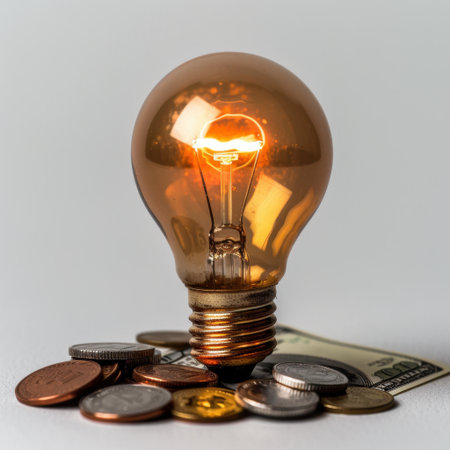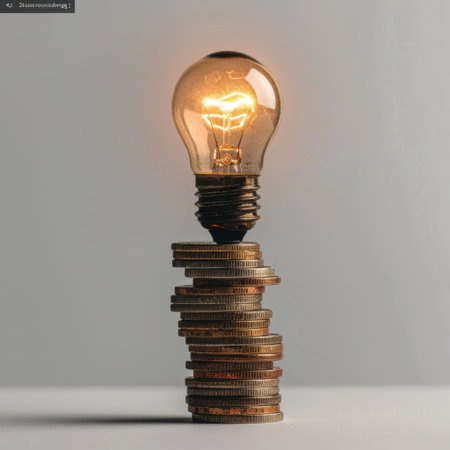 A glowing light bulb surrounded by various coins and a dollar bill, symbolizing the intersection of innovation and financial thinking in a minimalist setting.