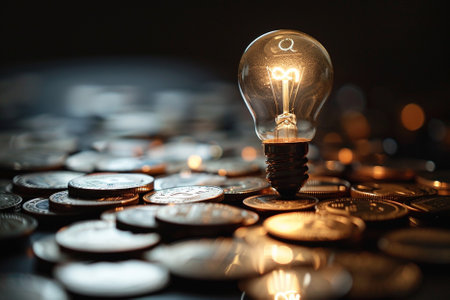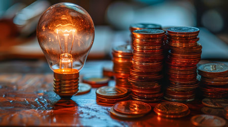 A creative composition featuring a lightbulb resting on a stack of coins, symbolizing the transformation of innovative ideas into financial success and growth opportunities.