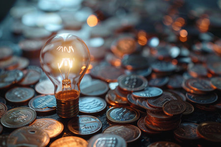 Creative light bulb sits atop jar filled with coins, symbolizing idea of saving and investment. warm glow of bulb contrasts beautifully with soft bokeh background, evoking sense of inspiration