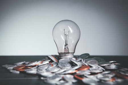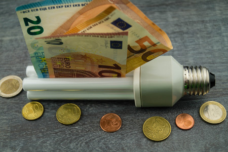Light bulb on, with banknotes, coins and energy bill. Increase in energy and gas tariffs. Efficiency and energy saving.