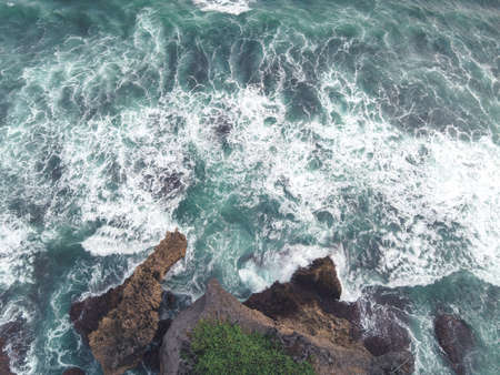 Top down aerial view of giant ocean waves crashing and foaming in coral beach