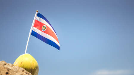 Coconut with Costa Rica flag on sky background, Central America Country Symbol, blank space