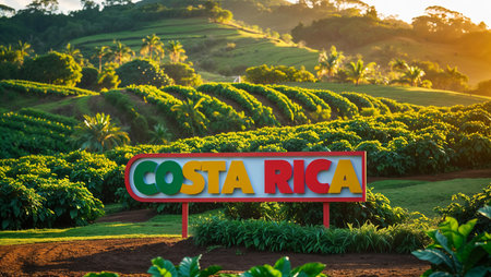 Costa Rica sign with coffee plantation in the background, sunny day