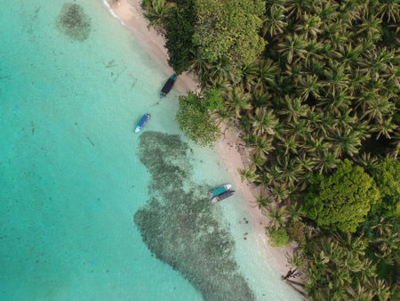 An aerial shot of an exotic beach with moored boats at shore