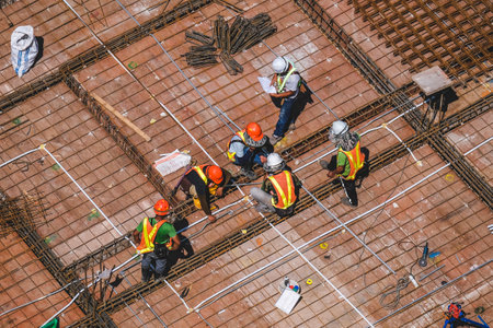 Construction workers in India standing on a rebar reinforcing bar platform making a pillar. Shot with an aerial view it shows the preparation work for pouring concrete to construct a skyscraper