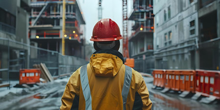 Construction worker in yellow safety vest and hard hat stands at construction site, observing the work with sunlight illuminating the environment, emphasizing safety and professionalism, AI generated