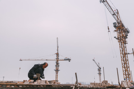 18 Dec,2014 Beijing. a men on a construction site in City with cranes ,takeing Bricks and