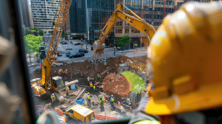 A bustling construction site featuring heavy equipment and workers actively engaged in digging and building in an urban environment. Safety gear is prominent.