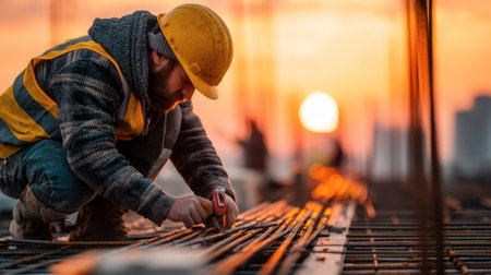 A focused worker in protective gear is tying rebar to build a steel frame for a concrete structure. This image shows the hard work and teamwork involved in a construction project.