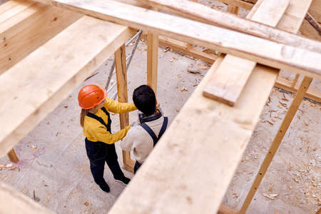 Top view on two caucasian engineers builders working together, building wooden cottage house. Skilled hardworking carpenters in special clothes work and hardhat. Two Skilled contractors