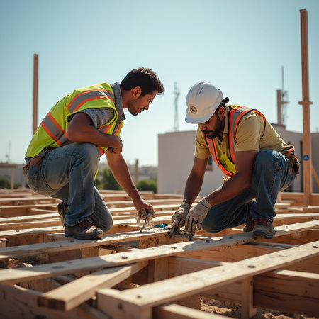 Sunlit construction team diligently working atop a scaffold, emphasizing the importance of safety gear in urban settings.