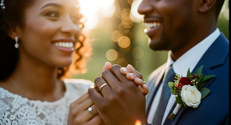 A smiling bride and groom holding hands, showcasing their wedding rings. The groom wears a blue suit with a flower boutonniere, and the bride wears a lace dress with earrings.