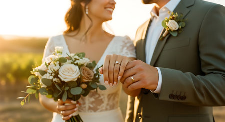 Close-up of a bride and groom's hands, showcasing their wedding rings and holding hands together in a romantic gesture, dressed in formal attire.