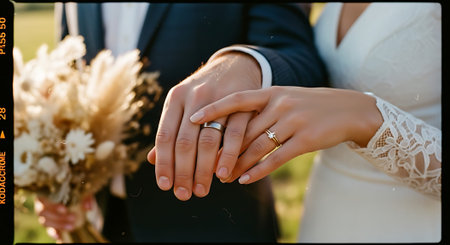 Close-up of a bride and groom holding hands, showcasing wedding rings and formal attire.