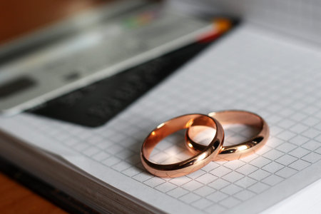 Two wedding rings and currency. Wedding rings and fifty euro. Wedding or divorce concept. Wedding Planning concept. Expenses.