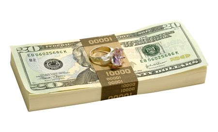 Wedding rings on a dollars sign. Expensive wedding concept. Old desk background.