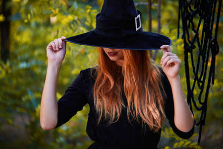 Witch hiding behind black hat. Mysterious ginger witch girl on a forest background. Halloween concept.