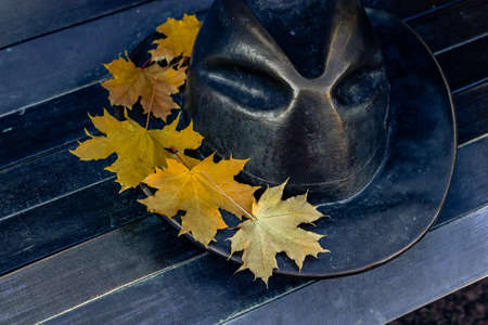Yellow maple leaves lie on a hat and a park bench, close-up.