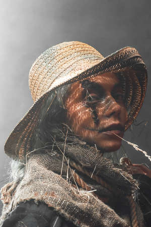 Atmospheric dark and illuminated background with smoke and scary and ripped woman in fashion of scarecrow with straw hat.